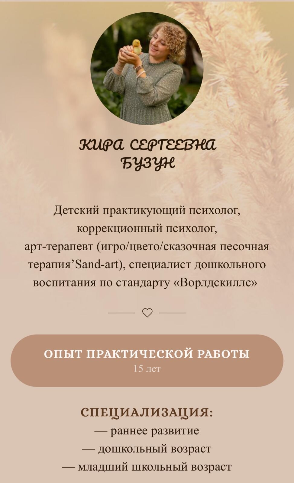 Специалист дополнительного развития "Soft Skill's" и дошкольного воспитания с опытом работы в данной области более 7 лет.